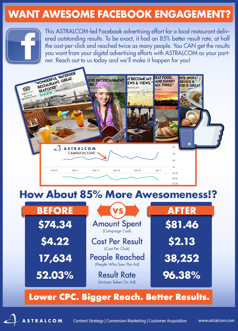 This ASTRALCOM-led Facebook advertising effort for a local restaurant delivered outstanding results. To be exact, it had an 85% better result rate, at half the cost-per-click and reached twice as many people. You CAN get the results you want from your digital advertising efforts with ASTRALCOM as your partner. Reach out to us today and we’ll make it happen for you!